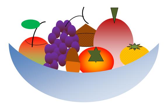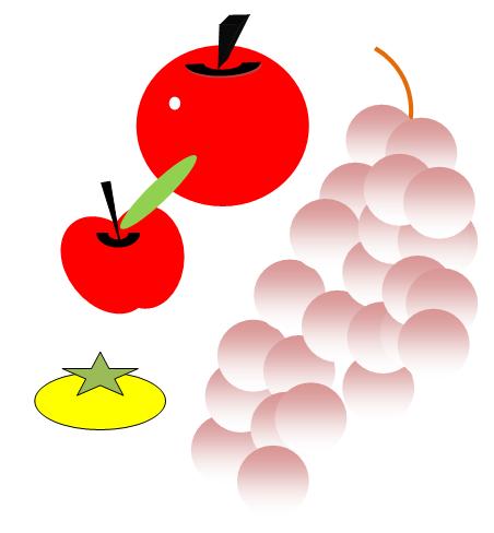 | まだ途中のようですが、とりあえずいくつかの果物ができて満足! この次は、皿に盛り合わせて素敵にレイアウト!ますますのってきてますよね。パソコンが楽しくって…と言ってました。葡萄のグラデーションの色合いがとてもいい色で気に入っていたようでした…。 |