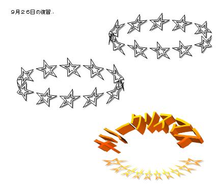 | まだ、パソコン歴3か月のみっちゃんなのですが、オートシェイプを使って絵を描き、グループ化するのを楽しんでいました。この日は、「団扇」の模様を描きました。これを団扇にして飾るのだそうです。この絵なら、星を光らせてアニメにもできますよね。アニメに挑戦する日も、もう間近…。 楽しみです。 |