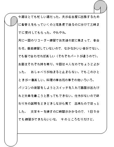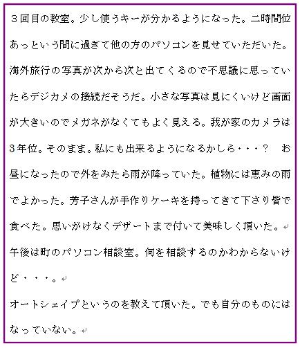 | この日の午後は、引き続き町主催のPC相談日だったので、昼休みに楽しいおしゃべりをしてから、また、パソコンにとりかかりました。最近は、少し勉強しなくちゃ…という雰囲気になり、文書作成に取り組むひとが多くなりました。みんな、1時からパソコンに向かい、夢中になって画面を見続けたので、パワーあふれる皆さんもさすがに3時頃にはペースが落ちてきました。「疲れるのは私だけではないんだ…」と思いました。私はいつもへとへとに疲れてしまいます…。 |