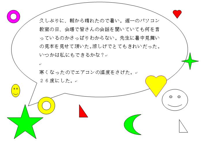 | この日はオートシェイプから出した図形を大きくしたり、小さくしたり、位置を変えたり自由自在に操作できるようにとマウスと闘っていました。ファイルに「名前を付けて保存」や「上書き保存」など、何回も練習してました。着実に力をつけていますよね。 |