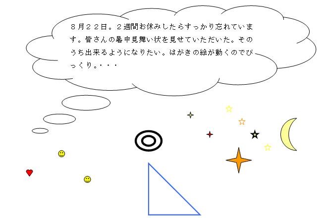| みっちゃんの文章の中で、「ハガキの絵が動く…」とあるのは、ハガキに描いてあった「にゃんこさんの風鈴の絵(金魚が泳いでいる)」をアニメにして皆さんに見せたのでびっくりしたようでした。みっちゃんって新鮮な感覚で物事を受け止めるのでとっても楽しいです。いつも文を読んでいると、PCクラブに中の様子がよく分かりますよね〜。とても参考になります…。 |