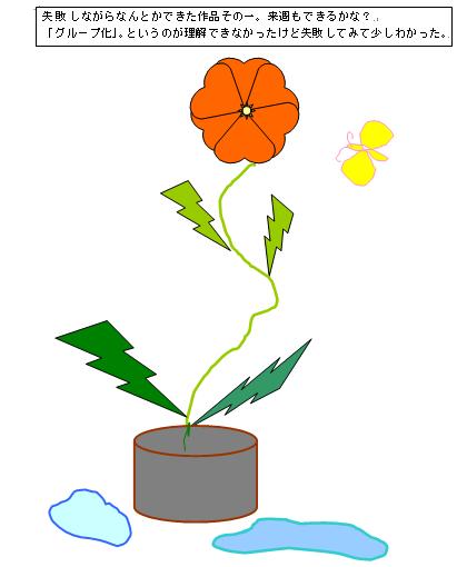 | この日完成しなかったので、続きを家でやったといってメールで送ってきました。花瓶は逆三角形▽と♡を逆さにしたのと楕円を組み合わせて、「線なし」にして色を塗ったそうです。みんなが、まこさんの周りに集まって、うなづきながら、感動しながら聞き入っていました。まこさんのアイディアってすばらしいですね。 |