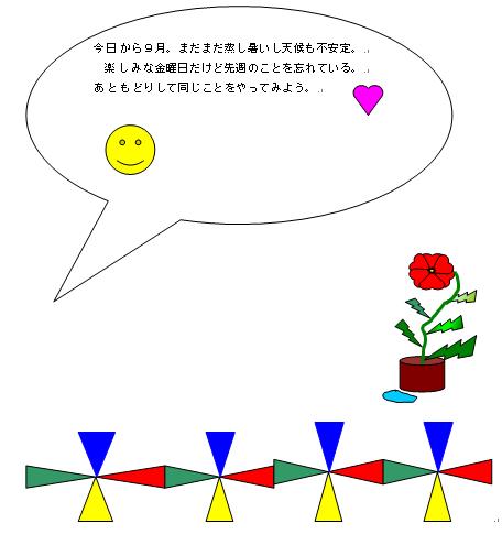 | 三角形を利用して模様を作り、グループ化の練習を繰り返していました。「グループ化」したものを「コピー」して「貼り付け」る練習がとても楽しそうでした。 |