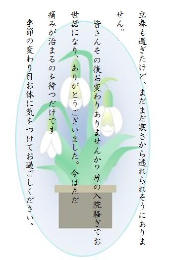 ☆みっちゃんは、午前・午後の両方に参加して、可憐なスノードロップを描きました。午後は、それをハガキの透かし模様にして手紙を書きました。