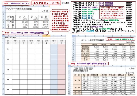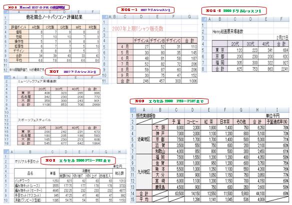 上記のように、たくさんのデータを使って同じ機能を何回も復習しながら進んでいます。NO1〜NO9までは「入力・表の作成・合計・数式コピー・オートフィル機能・平均・行の高さ・列の幅・セルの結合・セルの挿入・達成率・小数点・カンマ・%表示・列の表示、非表示」などを学習しています。いわゆるパソコンを使っての、足し算・掛け算・割り算などの勉強を中心に進めています。この学習を終えたら、NO10から、テスト形式でちょっと新しい機能も含めながらNO14まで進みます。NO15からは絶対参照などの学習に入る…という形で進めています。