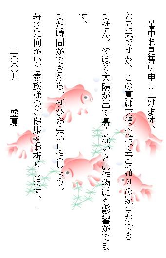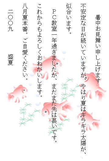 ☆みっちゃんは、金魚の絵を仕上げて透かし模様にし暑中見舞いにしました。金魚をひとつ作ってから、それをコピーしていくつも張り付けて、向きを変えて楽しんでいました。パソコンクラブ宛てと友人宛ての、2バージョン仕上げていました。素晴らしいですね。