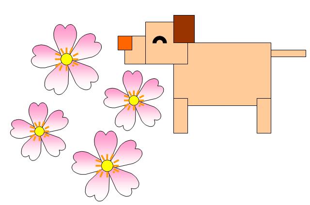 2010,4月の作品 ほそちゃんの花と犬(使用ソフト:ワード) 花に囲まれたワンちゃんが幸せそうですね…! |