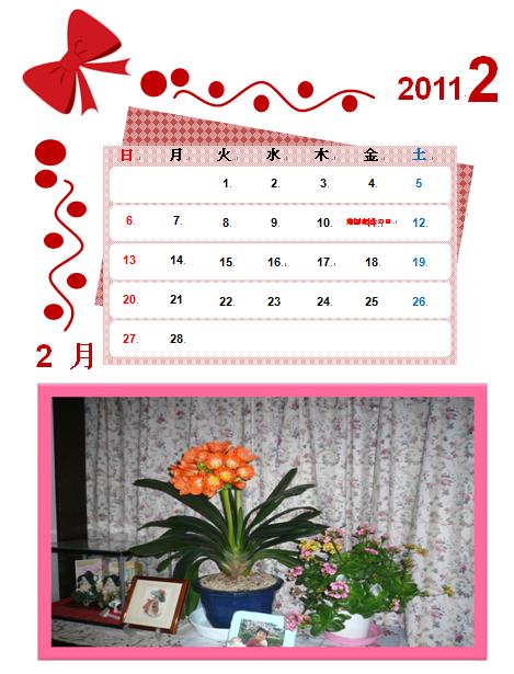| 2011年2月25日の作品 うーさんのカレンダー“2月” NHK趣味工房(火)夜10:00〜10:25を見て作ったようです。 (使用ソフト:ワード) |