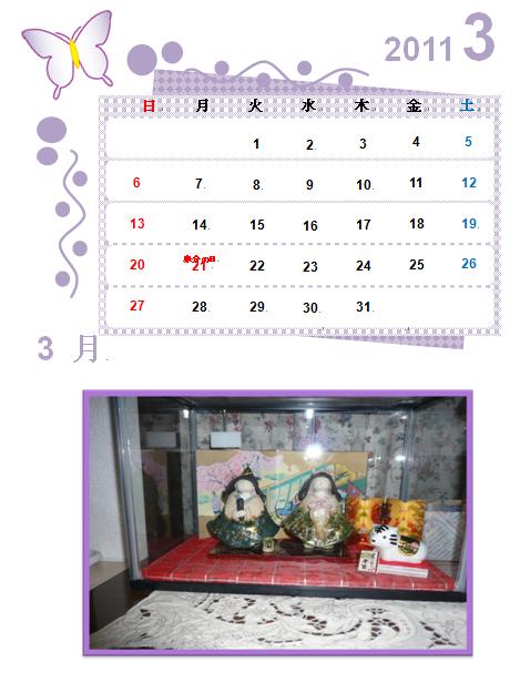 2011年2月25日の作品 うーさんのカレンダー“3月” 写真入りで良い記念になりますね。 (使用ソフト:ワード) |