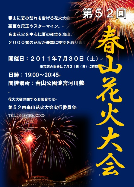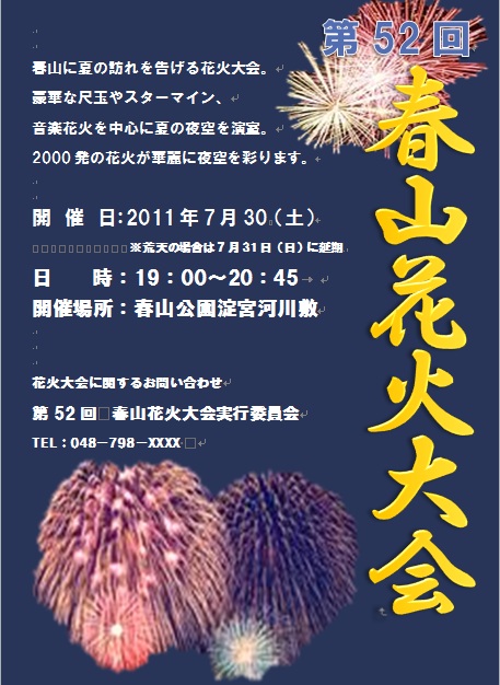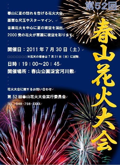 2012年10月10日の作品 もっちゃんの“花火大会のちらし” (使用ソフト:ワード) すごい迫力ですね〜 |