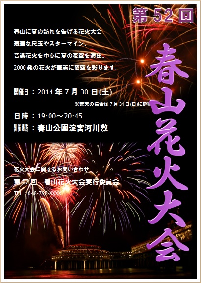 2013年10月18日の作品 はるちゃんの“花火大会” (使用ソフト:ワード) 普通に「花火大会」を学習してから、文字の色やクリップ アートを変えて、オリジナル版に取り組みました。文字を 藤色にするって素敵ですよね〜。花火の図もおしゃれ! 今年の4月入会したばかりとは思えないです(^_^)。 |