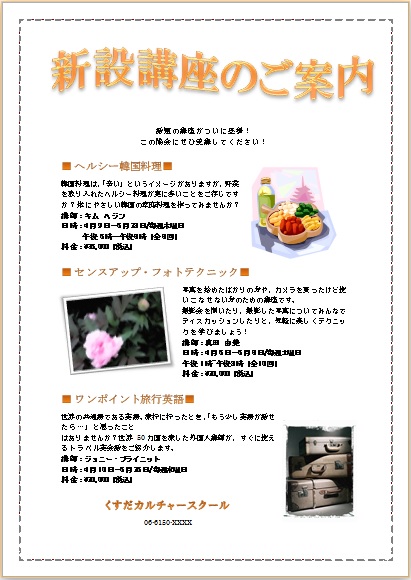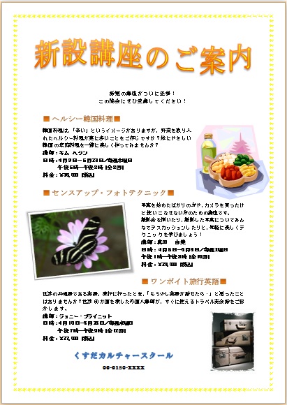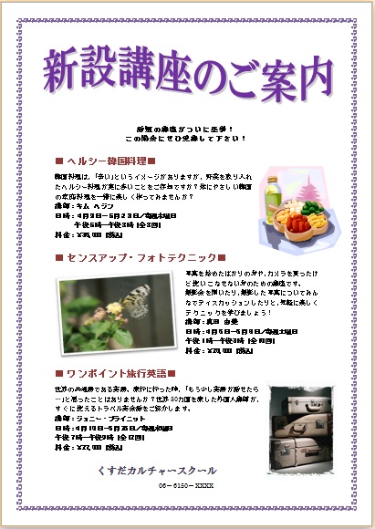 2013年10月11日の作品 ほそちゃんの“新設講座” (使用ソフト:ワード) タイトルとページ罫線の紫色に統一感を持たせて いてとてもさわやかな感じでいいですよね〜(^_^) 悩んだ分だけ、結果に反映されているようですね。 |