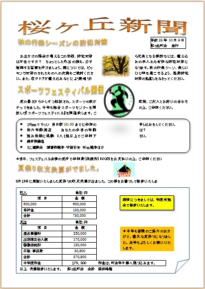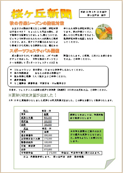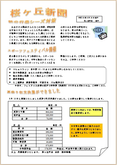 2013年10月9日の作品 メールで送られてきました もっちゃんの“桜ヶ丘新聞” (使用ソフト:ワード) 好みのイラスや写真をきれいに配置してくださって 楽しいですね。少しずつ個性が現れた作品が並ぶと 楽しさが増しますよね。参考になります。 |