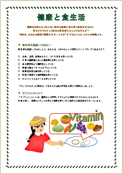 2013年10月13日の作品 メールで送られてきました まさこさんの“健康な生活” (使用ソフト:ワード) 今回は食生活に関するイラストは自由に描いてもらう という課題にしたら、さすがまさこさんですね〜。 こんなに愛くるしい女の子が登場して楽しいです(^_^)。 |