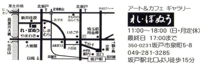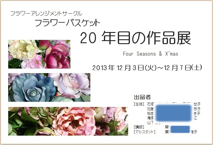 | 2013年9月25日の作品 まよちゃんの“フラワーアレンジメント” (使用ソフト:ワード) すてきな作品展ですね〜。 文化祭で作品を拝見したことがありますが夢のような雰囲気を かもし出していましたよ。うっとりしてしまいました。 坂戸の「れ・ぼぬう」に出かけてみたいですね。招待状の裏に のっている地図を見て12/3〜12/7の間に覗いて見てください。 |