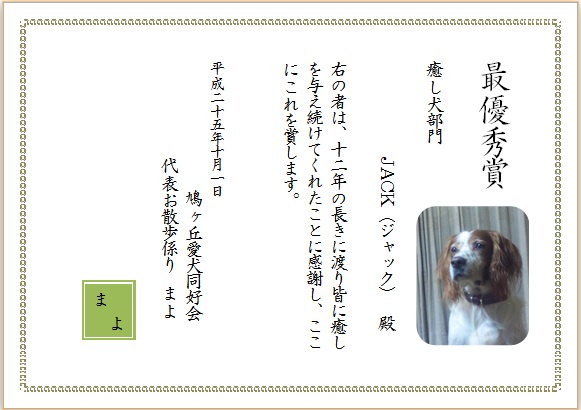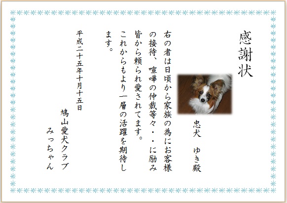 | 2013年10月15日の作品 メールで送られてきました みっちゃんの“感謝状” (使用ソフト:ワード) かわいい愛犬ですね〜。 感謝状の文面をしっかり読んでしまいました。 忠犬ゆきちゃんも喜んでいるでしょうね〜(^_^) |