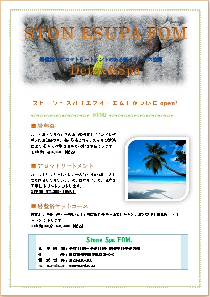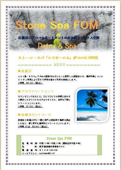 2013年10月2日の作品 まよちゃんの“ストーン・スパ” (使用ソフト:ワード) 品よくきれいに仕上げていますよね(^_^) 短時間に仕上げてしまったので驚きました。 |