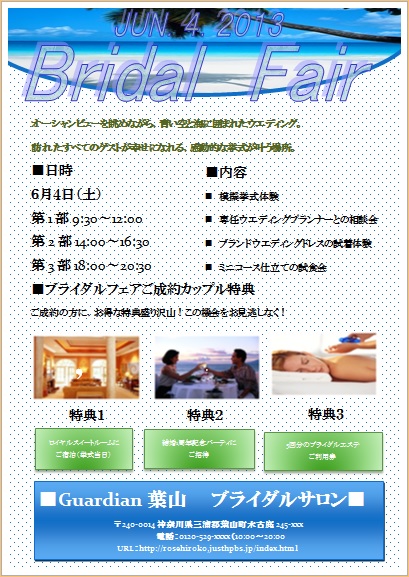 | 2013年10月15日の作品 メールで送られてきました みっちゃんの“ブライダルフェアー” (使用ソフト:ワード) 空の碧さと一番下の広告の部分の碧さのバランスが すてきですね〜。緑のグラデーションもステキ! 完璧ですね〜(^_^)。 |