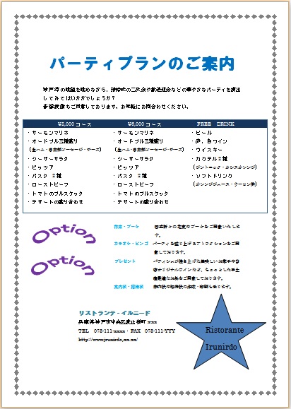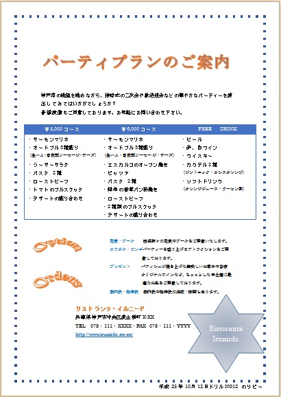 2013年10月15日の作品 メールで送られてきました みっちゃんの“パーティプラン” (使用ソフト:ワード) タブできれいにレイアウトするのが難しかったですよね〜。 でも頑張ってきれいにまとめたのはすごい!!! 色合いも自然でいいですね〜(^_^)。 |