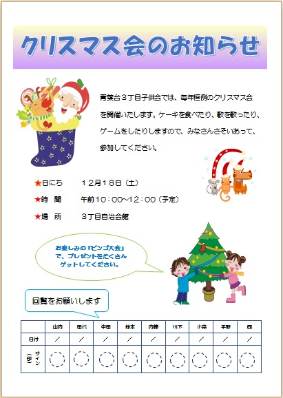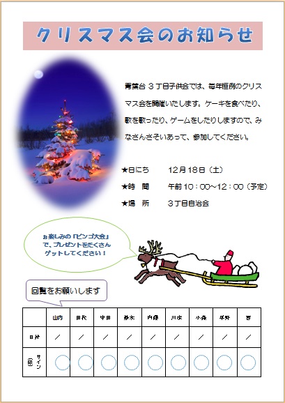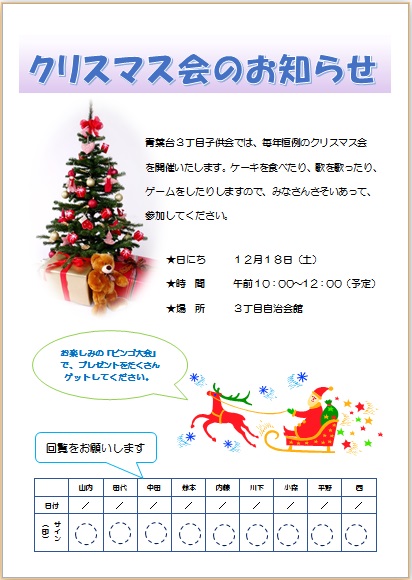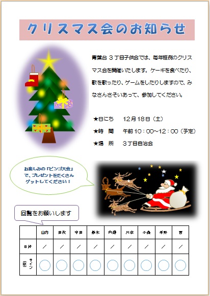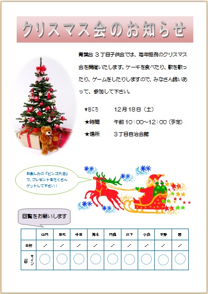| 2013年12月4日の作品 まさこさんの“クリスマス会のお知らせ-1” (使用ソフト:ワード) |