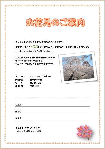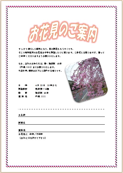 2013年11月29日の作品 メールで届きました のりピーさんの“お花見のご案内” (使用ソフト:ワード) |