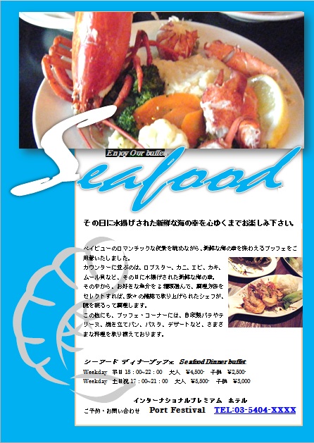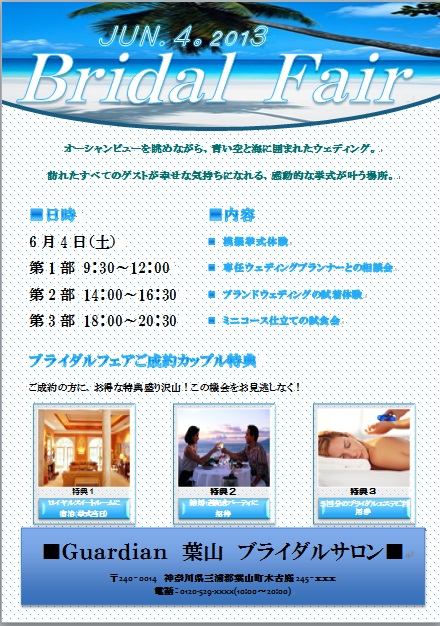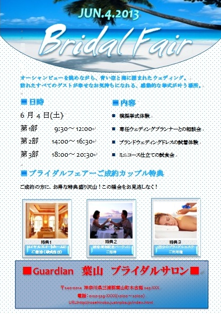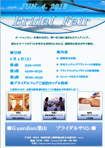 | 2013年2月11日の作品メールで届きました(^_^) にゃんこさんの“ブライダルフェア―” (使用ソフト:ワード)海の写真の所のフォントを頑張って さがしたのですね〜。すばらしいです。 |