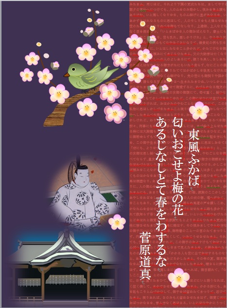 2013年2月19日の作品 メールで届きました(^_^) まこさんの“道真の歌”(使用ソフト:ワード) 源氏物語のバリエーションの発想がすばらしいですね。 ワードで描いた梅や鳥、源氏物語の写真などもうまく 活用させるなんて、さすがですね〜。 |