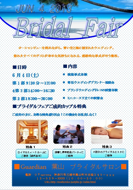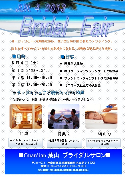 | 2013年4月8日の作品 メールで送られてきました(^_^) ほそちゃんの“ブライダルフェアー”(使用ソフト:ワード2007) ブルーがとても印象的なポスター。爽やかな気分にれますね〜(^_^)。 |