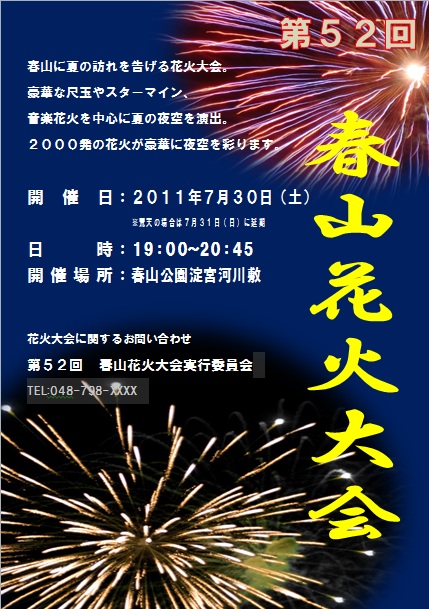 2013年3月29日の作品 コッシーさんの“花火大会”(使用ソフト:ワード2010) 花火を目いっぱい大きくするのって大変ですが迫力がでますよね〜(^_^)。 |