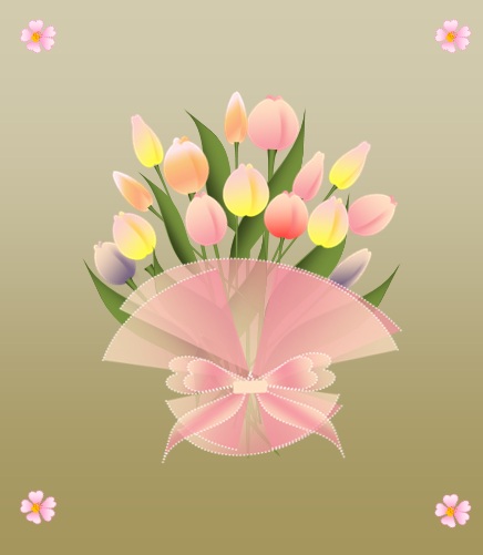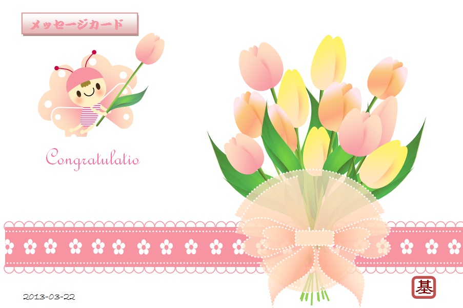 | 2013年3月22日の作品 メールで送られてきました (^_^) もっちゃんの“メッセージカード・チューリップ”(使用ソフト:ワード2010) こんな包装紙や紙のバックがあったら幸せですね〜。商業用に使えそう…(^_^)。 優しさ溢れる作品に心が和みます。(^_^) |