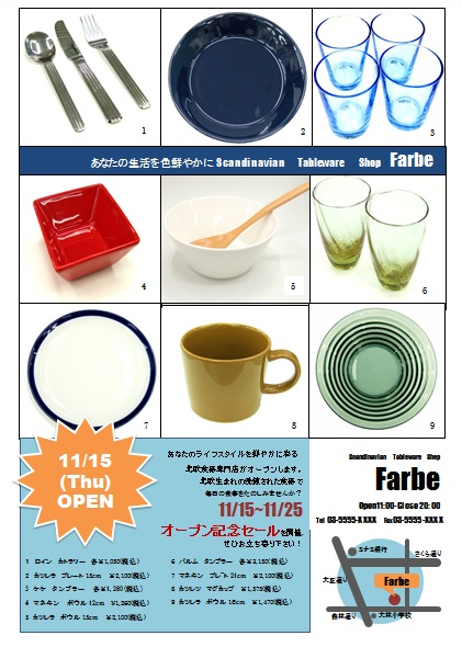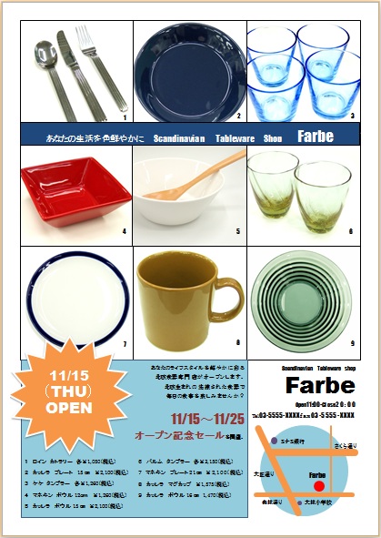 2013年3月13日の作品 メールで送られてきました(^_^) もっちゃんの“食器専門店”(使用ソフト:ワード2010) 写真をたくさん使って大変だったでしょうね。完璧な仕上がりにびっくりです。 |