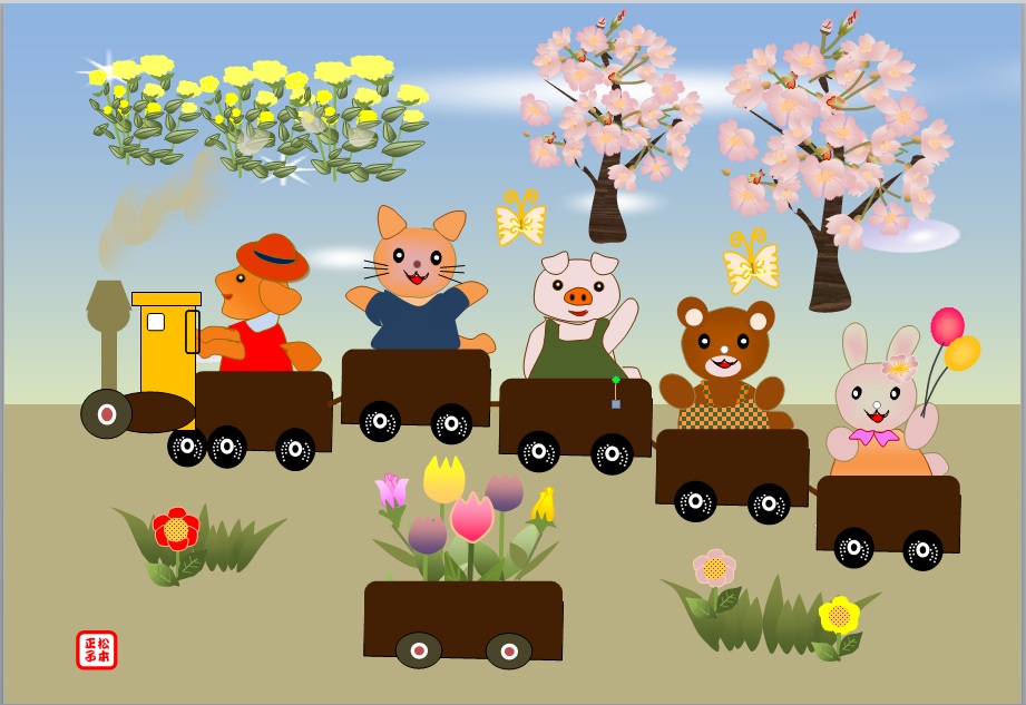 | 2013年3月15日の作品 メールで送られてきました(^_^) まこさんの“お花見列車”(使用ソフト:ワード2010) 動物さんたちを描くのって難しいと思うのですが、さすがですね〜(^_^) SLの煙もかすかに上がっているのもほほえましいですね。 |