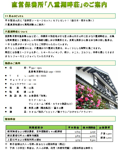 | 2013年4月10日の作品 メールで送られてきました(^_^) もっちゃんの“直営保養所”(使用ソフト:ワード2010) 写真のトリミングや背景の削除など高度な技術の課題を難なく 仕上げてしまいましたね〜。もっちゃんには、脱帽です(^_^)。 |