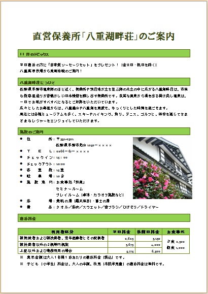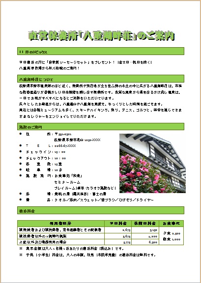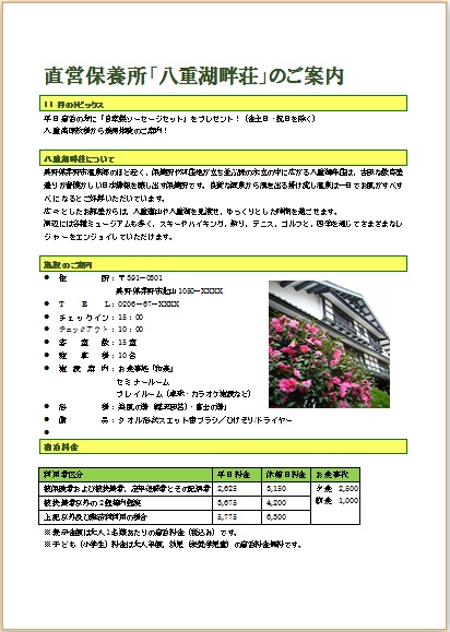 2013年8月15日の作品 メールで送られてきました(^_^) “ほそちゃんの直営保養所” (使用ソフト:ワード2007) とてもきれいに仕上げていますよね〜。 次回も楽しみです(^_^)。 |