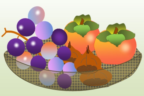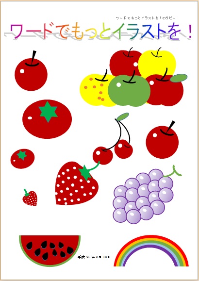 | 2013年8月13日の作品 メールで送られてきました(^_^) “まこさんの秋の味覚” (使用ソフト:ワード2010) ぶどうがとてもおいしそう。グラデーションが効いてますよね(^_^) 柿も栗も、もうじき出回ってきますし、さすがまこさん、 季節を先取りしてますね!(^^)! |