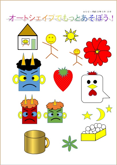 | 2013年8月16日の作品 “のりピーさんのお絵かき” (使用ソフト:ワード2013) この4/10に入会したばかりなのにぐんぐん腕を上げています。 文書だけでもすでに50も仕上げてしまいました。 あっという間に上達、秋の文化祭が楽しみです(^_^) |