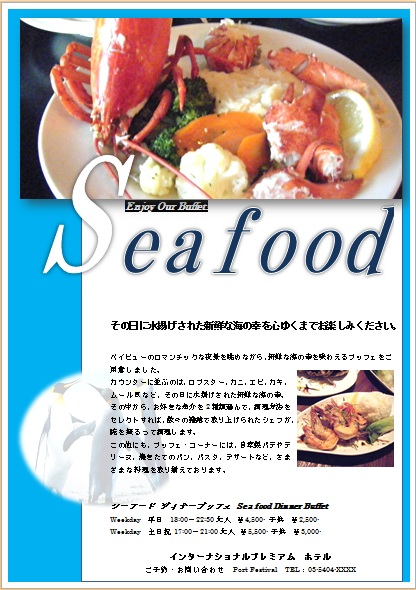 2013年7月10日の作品 メールで送られてきました(^_^) “しーさんのシーフード” (使用ソフト:ワード2010) 初めての作品発表です。すばらしい作品ですよね(^_^) |