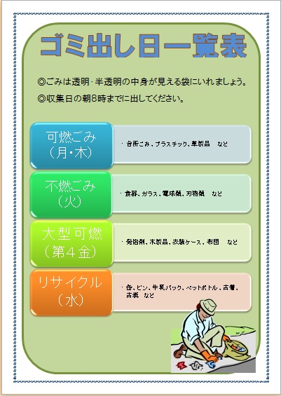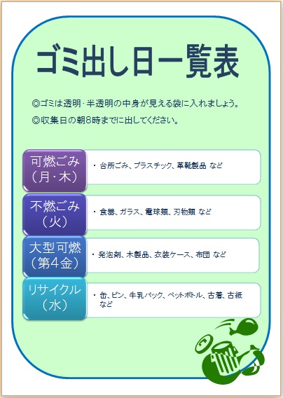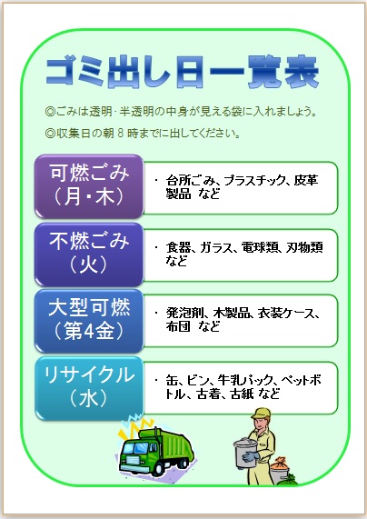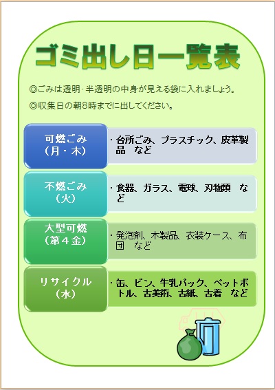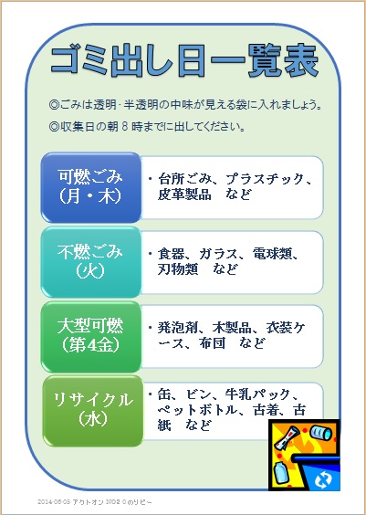2014年6月11日 まよちゃんの“ゴミ出し日一覧表” (使用ソフト:ワード) |