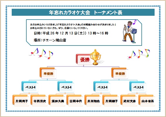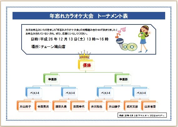 2014年6月4日 メールで届きました(^_^) のりピーさんの“カラオケトーナメント表” (使用ソフト:ワード) |