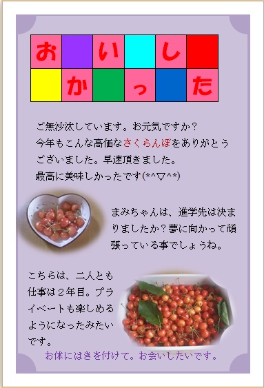 | 2014年7月27日 メールで届きました(^_^) まこさんの“残暑見舞い” (使用ソフト:ワード) さすがですね〜(^_^) |