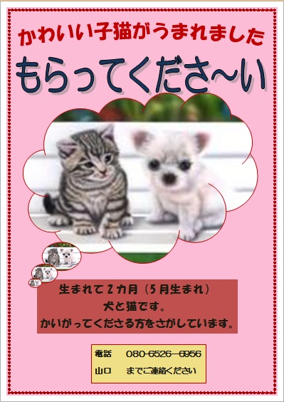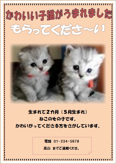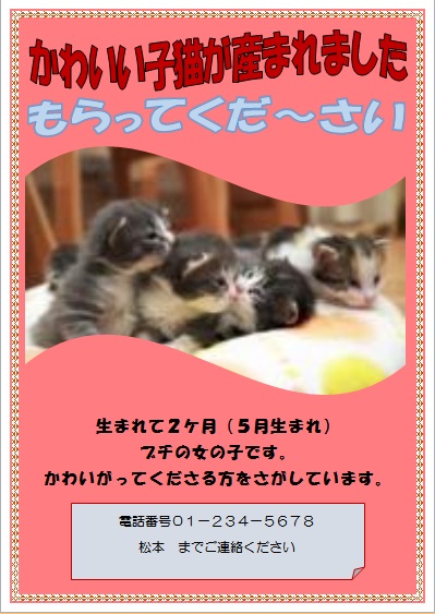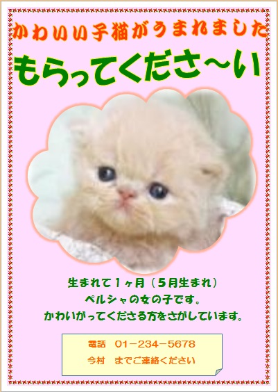 | 2015年3月13日の作品 メールで届きました(^_^) にゃんこさんの“子猫もらって〜” (使用ソフト:ワード) |
