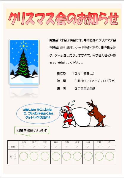 2018年10月12日の作品 よこちゃんの“クリスマス会の回覧板” (使用ソフト:ワード) |