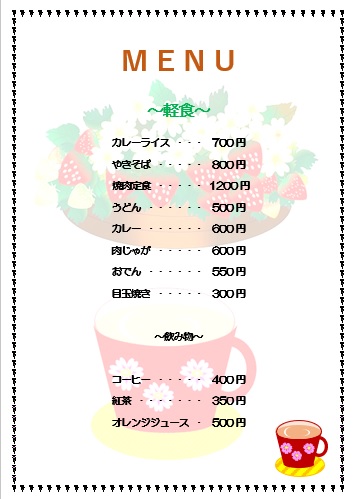 12月4日の作品 さ〜ちゃんの“軽食メニュー” (使用ソフト:ワード) |