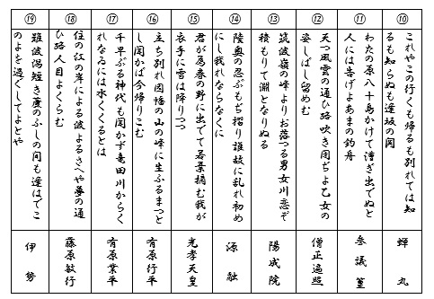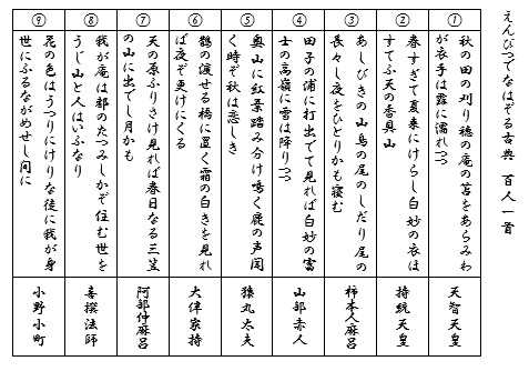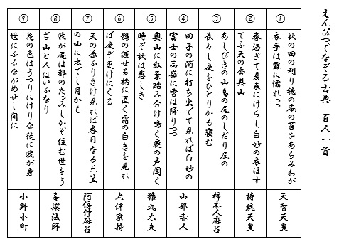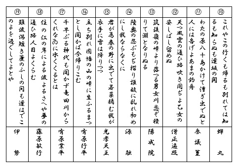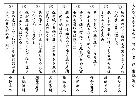 | 10月16日の作品 せっちゃんの“百人一首-2” (使用ソフト:ワード) なぞり書きなので印刷は薄しています。 |