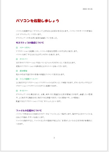 | 2022年10月26日の作品 なかちゃんの“パソコンの起動” 使用ソフト:ワード 書式のコピーと貼付け、ヘッダーフッター、ページ番号の書式設定 |