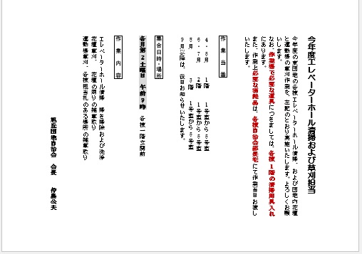 | 2022年12月21日の作品 なかちゃんの“自治会のお知らせ” 使用ソフト:ワード 横書に入力して、縦書きに直す、数字も縦書きに直す等の学習 |