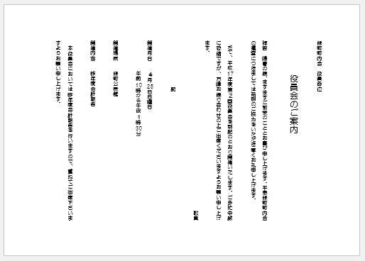 2022年12月21日の作品 なかちゃんの“役員会のご案内” 使用ソフト:ワード 横書に入力して、縦書きに直す、数字も縦書きに直す等の学習 |