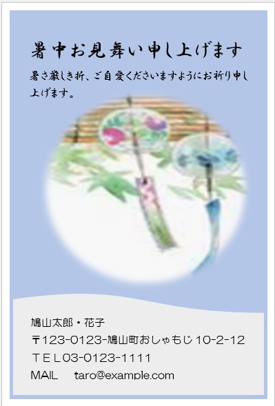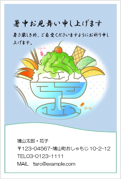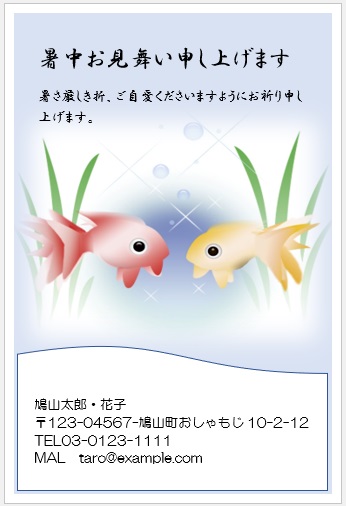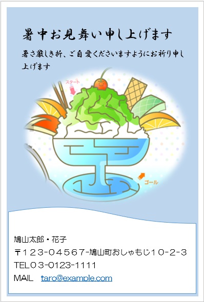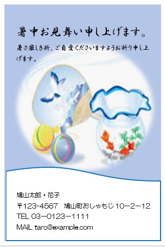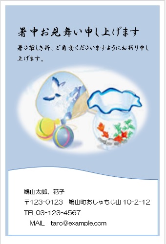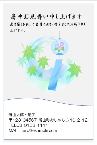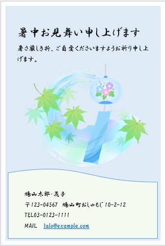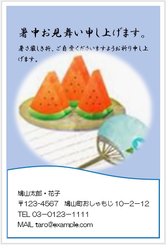 2022年4月13日の作品 まこさんの“暑中見舞い” (使用ソフトワード) 図形を回転/文字は回転させない・図の効果/ぼかし等の学習 |