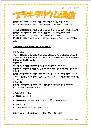 2022年8月12日の作品 海ゆかばさんの“プラネタリウム通信” (使用ソフト:ワード) |