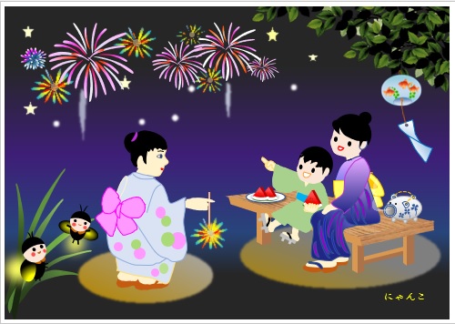 | 去年の作品ですがじっくり鑑賞してください にゃんこさんの“花火” 蛍や豚の蚊取り線香、子どもの下駄も。 (使用ソフト:ワード) |